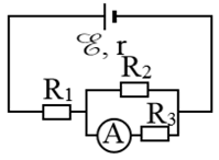 Cho mạch điện có sơ đồ như hình bên: \(E = 24V \,;\,R_1 = 8\Omega \,;\,R_2 = R_3 = 20\Omega .\) Bỏ qua điện trở của ampe kế \(A\) và dây nối. Số chỉ của ampe kế là \(0,6A\). Giá trị điện trở trong \(r\) của nguồn điện là?