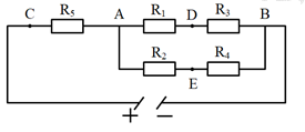 Cho mạch điện như hình vẽ. Có một Vôn kế V có điện trở rất lớn, \({R_1} = 6\Omega ;\,\,{R_2} = 3\Omega ;\,\,{R_3} = 12\Omega ;\,\,{R_4} = 6\Omega ;\,\,{R_5} = 6\Omega ;\,\,U = 12V\). Nối Vôn kế giữa D và E thì Vôn kế chỉ bao nhiêu?