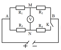 Cho mạch điện như hình vẽ. Biết \({R_1} = 8\Omega ;\,\,{R_2} = 4\Omega ;\,\,{R_3} = 6\Omega ;\,\,{R_4} = 4\Omega ;\,\,U = 12V\). Vôn kế có điện trở rất lớn, điện trở khóa K không đáng kể. Khi K mở, Vôn kế chỉ bao nhiêu?