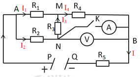 Cho mạch điện như hình vẽ. Vôn kế có điện trở rất lớn. Ampe kế và khóa K có điện trở