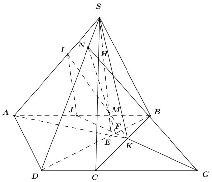 Cho hình chóp S.ABCD có đáy ABCD là hình thang \(\left( AB\parallel CD,\,\,AB>CD \right)\). Gọi I, J, K