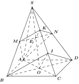 Cho hình chóp \(S.ABCD,\) đáy \(ABCD\) là hình bình hành tâm \(O.\) Gọi \(M,N\) lần lượt là trung điểm \(SB,SD.\) Gọi \(K\) là giao điểm của \(\left( {AMN} \right)\) với \(SC.\) Trong \(\left( {SAC} \right),\) vẽ đường thẳng qua \(O\) và song song với \(AK,\) cắt \(SC\) tại \(I.\)