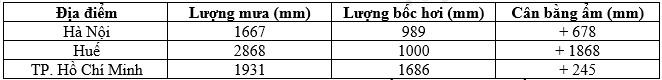 Cho bảng số liệu LƯỢNG MƯA, LƯỢNG BỐC HƠI VÀ CÂN BẰNG ẨM CỦA MỘT SỐ ĐỊA ĐIỂM Để