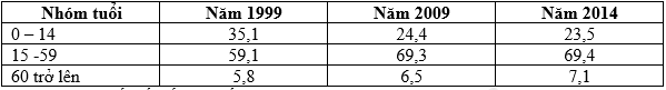 Cho bảng số liệu: CƠ CẤU DÂN SỐ THEO NHÓM TUỔI CỦA VIỆT NAM GIAI ĐOẠN 1999 – 2014