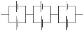 Tìm suất điện động và điện trở trong của bộ nguồn gồm \(6\) ắcquy mắc như hình vẽ. Biết mỗi ắcquy có \(\xi = 3V;{\rm{ }}r = 2\Omega \)