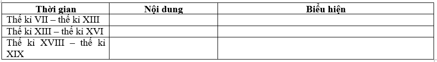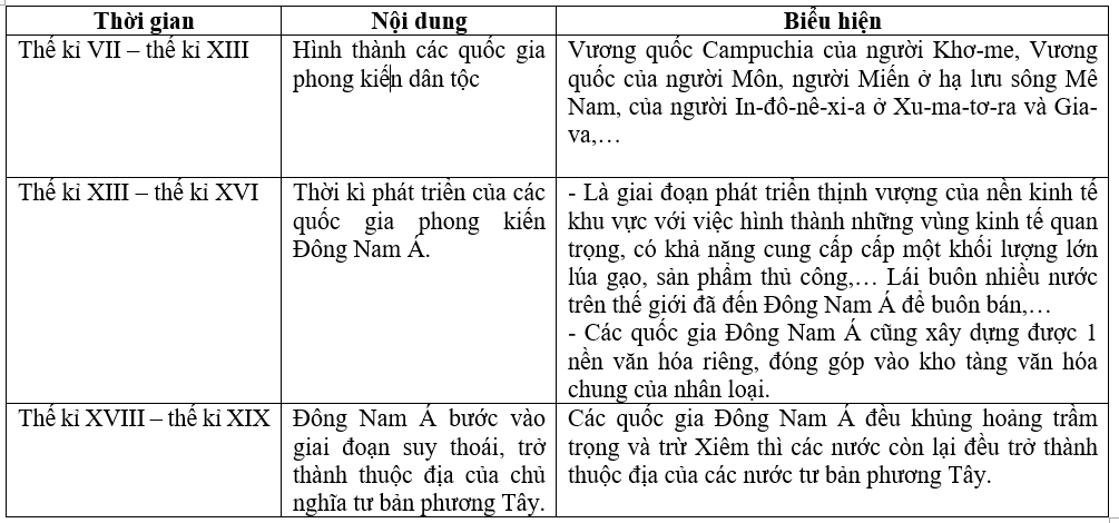 Tóm tắt các giai đoạn lịch sử lớn trong sự phát triển của khu vực Đông Nam Á đến giữa thế kỉ XIX theo bảng sau: