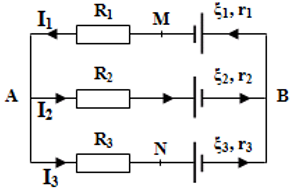 Cho mạch điện như hình vẽ, trong đó \({\xi _1} = 3V,{r_1}\; = 0,5\Omega ,{\xi _2} = 6V,{r_2}\; = 1\Omega ,{\xi _3} = 9V,\)