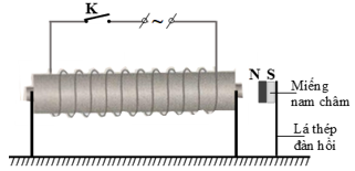 Có hiện tượng gì xảy ra với miếng nam châm khi cho dòng điện xoay chiều chạy vào nam châm điện ở hình vẽ dưới đây?