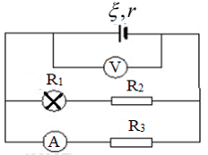 Cho mạch điện như hình vẽ. Nguồn điện có \(\xi = 6V;r = 0,6\Omega \). Mạch ngoài gồm \({R_1}\) là một bóng đèn \(\left( {2V-2W} \right);{R_2}\; = {R_3}\; = 4\Omega \) . Ampe kế và dây nối có điên trở không đáng kể. Vôn kế có điện trở rất lớn. Cường độ dòng điện qua mạch chính và số chỉ của vôn kế, ampe kế là: