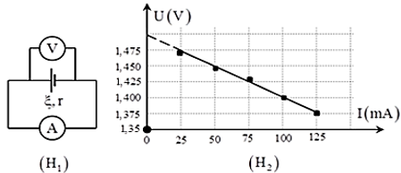 Để đo suất điện động và điện trở trong của một cục pin, một nhóm học sinh đã mắc sơ đồ mạch điện như hình (H1). Số chỉ của vôn kế và ampe kế ứng với mỗi lần đo được được cho trên hình vẽ (H2). Nhóm học sinh này tính được giá trị suất điện động \(\xi \) và điện trở trong \(r\) của pin là: