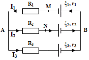 \({r_3}\; = 2\Omega ,{R_1} = 2,5\Omega ,{R_2} = 3\Omega ,{R_3} = 4\Omega \) . Tìm \({U_{MN}}\) ?