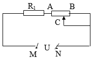 Cho mạch điện như hình vẽ. AB là biến trở con chạy C có điện trở toàn phần là \(120\,\,\Omega \). Nhờ có biến trở làm thay đổi cường độ dòng điện trong mạch từ \(0,9\,\,A\) đến \(4,5\,\,A\). Tìm giá trị của điện trở \({R_1}\).