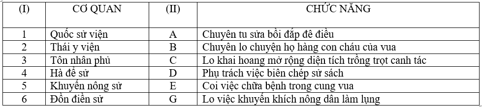 Ghép các chữ số (1, 2,...) đứng trước tên các cơ quan trong bộ máy nhà nước thời Trần ở cột (1) với các chữ cái (A, B,...) đứng trước các chức năng tương ứng ở cột (II) sao cho thích hợp.