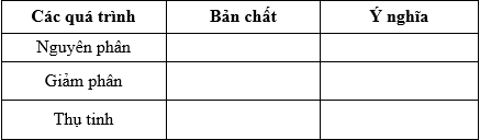 hoàn thành bảng sau về bản chất và ý nghĩa của các quá trình nguyên phân, giảm phân và thụ