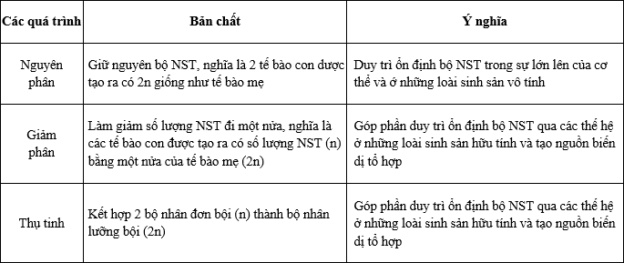 hoàn thành bảng sau về bản chất và ý nghĩa của các quá trình nguyên phân, giảm phân và thụ tinh.