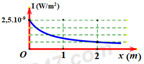 Tại một điểm trên trục \(Ox\) có một nguồn âm điểm phát âm đẳng hướng ra môi trường. Hình vẽ bên là đồ thị biểu diễn sự phụ thuộc của cường độ âm \(I\) tại những điểm trên trục \(Ox\) theo tọa độ \(x.\) Cường độ âm chuẩn là \({I_0}\; = {10^{-12\;}}W/{m^2}\). \(M\) là điểm trên trục \(Ox\) có tọa độ \(x = 4 m.\) Mức cường độ âm tại \(M\) có giá trị gần nhất với giá trị nào sau đây?