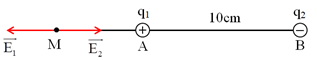 Cho hai điện tích \({q_1} = 16\,\,nC\) và \({q_2} = - 36\,\,nC\) đặt tại hai điểm \(A,\,\,B\) trong không khí với \(AB = 10\,\,cm\). Vị trí của điểm \(M\) mà tại đó cường độ điện trường bằng \(0\)