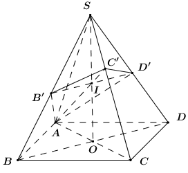 Cho hình chóp tứ giác đều \(S.ABCD\). Mặt phẳng \(\left( P \right)\) qua \(A\) và vuông góc với \(SC\) cắt \(SB,\,\,SC,\,\,SD\)lần lượt tại \(B',\,\,C',\,\,D'\) sao cho \(SB '= 2BB'\). Tỉ số giữa thể tích hình chóp \(S.AB'C'D'\) và thể tích hinh chóp \(S.ABCD\)bằng