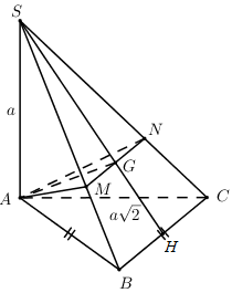 Cho hình chóp S.ABCcó đáy là \(\Delta ABC\) vuông cân ở \(B,{\mkern 1mu} \)\(AC = a\sqrt 2 ,{\mkern