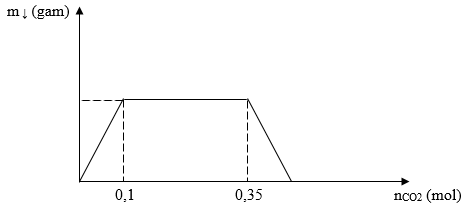 Sục CO2 từ từ đến dư vào 500 ml dung dịch NaOH xM và Ba(OH)2 yM. Sự phụ thuộc của khối lượng kết tủa vào số mol CO2 được biểu diễn qua đồ thị sau: