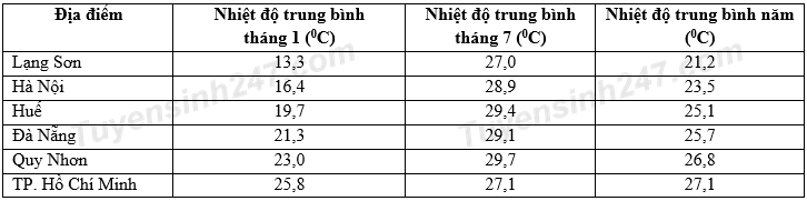 Dựa vào bảng số liệu sau: Nhận xét về sự thay đổi nhiệt độ từ Bắc vào Nam của nước