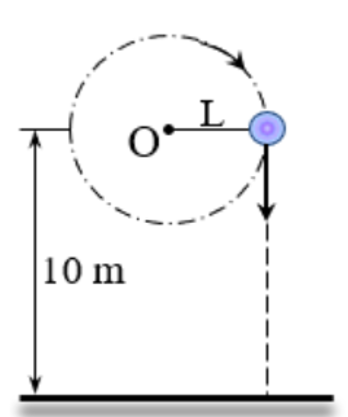 Một sợi dây không dãn, chiều dài \(L = 0,5m\), khối lượng không đáng kể. Một đầu giữ cố định ở O cách mặt đất \(10m\), còn đầu kia buộc vào viên bi nặng. Cho viên bi quay tròn đều trong mặt phẳng thẳng đứng với tốc độ góc \(\omega = 10rad/s\). Khi dây nằm ngang và viên bi đang đi xuống thì dây bị đứt. Lấy \(g = 10m/{s^2}\).
