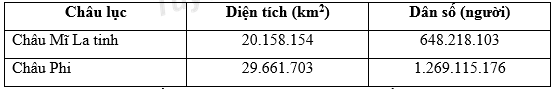 Bảng: Diện tích và dân số của châu Mỹ La tinh và châu Phi vào năm 2018 Cho biết vào năm 2018,