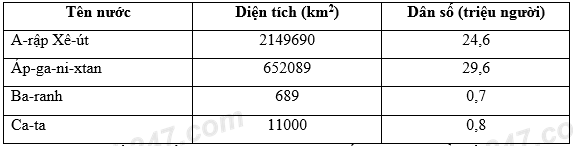 Qua bảng số liệu: DIỆN TÍCH, DÂN SỐ CÁC QUỐC GIA Ở KHU VỰC TÂY NAM Á- NĂM 2005 Để thể