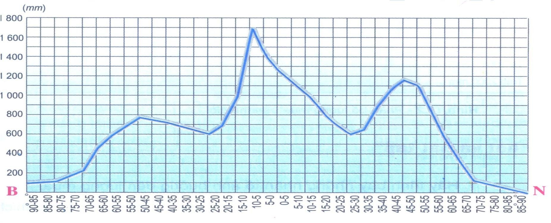 Cho hình vẽ: Sự phân bố lượng mưa theo vĩ độ: