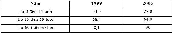 Cho bảng số liệu sau CƠ CẤU DÂN SỐ THEO NHÓM TUỔI Ở NƯỚC TA NĂM 1999 VÀ NĂM 2005 (Đơn vị: