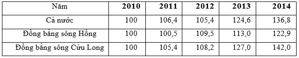 Biểu đồ thích hợp nhất thể hiện tốc độ tăng trưởng sản lượng tôm nuôi nước ta giai đoạn 2010-2014 theo bảng số liệu trên là