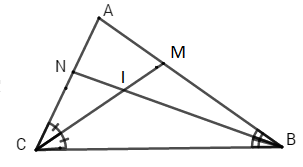 Cho \(\Delta ABC\)có\(AB > AC\) . Kẻ \(BN\) là tia phân giác của góc \(B\) \(\left( {N \in AC} \right)\).Kẻ \(CM\) là tia phân giác của góc \(C\) \(\left( {M \in AB} \right)\) , \(CM\) và \(BN\) cắt nhau tại \(I.\) So sánh \(IC\) và \(IB?\)