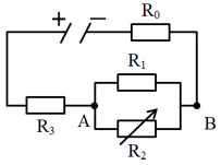 Cho mạch điện như hình vẽ, biết \(U = 120V;\,\,{R_0} = 20\Omega ;\,\,{R_1} = 60\Omega ;\,\,{R_3} = 40\Omega ;\,\,{R_2}\) là biến trở. Hỏi \({R_2}\) bằng bao nhiêu để công suất trên \({R_2}\) là lớn nhất. Tính công suất này.