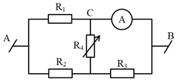 Cho mạch điện như hình vẽ, biết \(U = 4,2V;\,\,{R_1} = 1\Omega ;\,\,{R_2} = 2\Omega ;\,\,{R_3} = 3\Omega ;\,\,{R_4}\) là một biến trở. Ampe kế có điện trở không đáng kể. Điều chỉnh \({R_4}\) để công suất tỏa nhiệt của nó đạt giá trị cực đại. Tìm \({R_4}\) và số chỉ của Ampe kế khi đó.