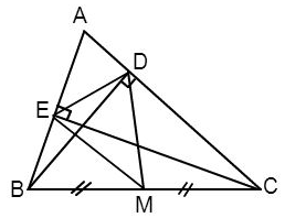 Cho \(\Delta ABC\), hai đường cao \(BD\) và \(CE.\) Gọi \(M\) là trung điểm của \(BC.\) Em hãy