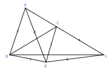 Cho tam giác \(ABC\) có \(AC > AB.\) Trên cạnh \(AC\)lấy điểm \(E\) sao cho \(CE = AB.\) Các đường trung trực của \(BE\) và \(AC\) cắt nhau tại \(O.\) Chọn câu đúng.