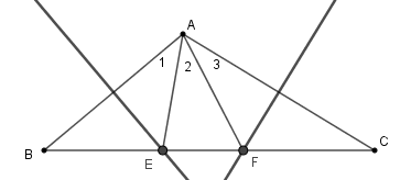 Cho tam giác \(ABC\) trong đó \(\widehat A = 100^\circ \). Các đường trung trực của \(AB\) và \(AC\) cắt cạnh \(BC\) theo thứ tự ở \(E\) và \(F\) . Tính \(\widehat {EAF}.\)