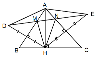 Cho \(\Delta ABC\) nhọn, đường cao \(AH.\) Lấy điểm \(D\) sao cho \(AB\) là trung trực của \(HD.\) Lấy điểm \(E\) sao cho \(AC\) là trung trực của \(HE.\) Gọi \(M\) là giao điểm của \(DE\) với \(AB,N\) là giao điểm của \(DE\) với \(AC.\) Chọn câu đúng.