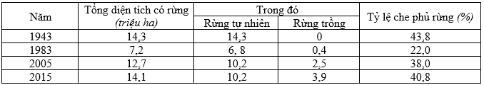 Cho bảng số liệu: BIẾN ĐỔI DIỆN TÍCH RỪNG VÀ ĐỘ CHE PHỦ RỪNG Ở NƯỚC TA, GIAI ĐOẠN