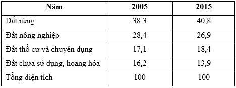 Nhận xét nào đúng về sự chuyển dịch cơ cấu diện tích đất của nước ta phân theo mục đích sử dụng thời kì 2005 -2015?