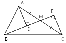 Cho \(\Delta ABC\) vuông tại \(A,M\) là trung điểm của \(AC.\) Gọi \(D,E\) lần lượt là hình chiếu của A và C xuống đường thẳng \(BM.\) So sánh \(BD + BE\)và \(AB.\)