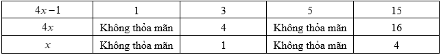 Cho \(4x - 1\) lần lượt bằng các ước của 15, từ đó tìm ra x.