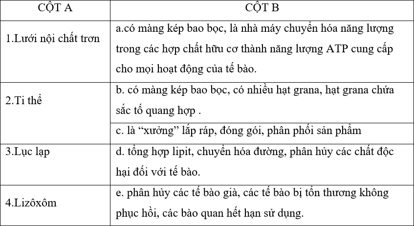 Hãy nối tên thành phần cấu trúc ở cột A đúng với đặc điểm cấu trúc , chức năng ở cột