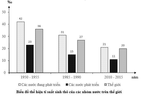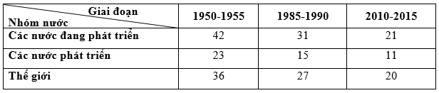 Cho bảng số liệu: Tỉ suất sinh thô ở các nhóm nước phát triển và đang phát triển qua các