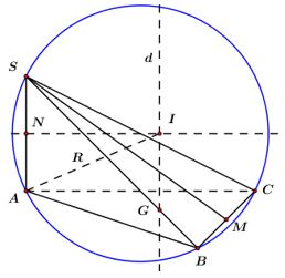 Dựng đường trung trực của \(SA,\) cắt \(d\) tại \(I\) \( \Rightarrow I\) là tâm mặt cầu ngoại tiếp khối \(SABC.\)