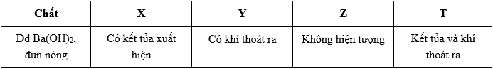 X, Y, Z, T là một trong các dung dịch sau: (NH4)2SO4, K2SO4, NH4NO3, KOH. Thực hiện thí nghiệm để xác