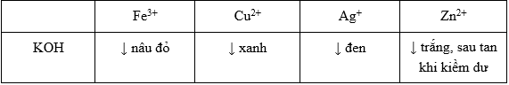 Có 5 lọ chứa hóa chất mất nhãn, mỗi lọ đựng một trong các dung dịch chứa cation sau (nồng độ mỗi dung dịch khoảng 0,01M): Cu2+, Ag+, Zn2+, Fe3+. Chỉ dùng một dung dịch thuốc thử KOH có thể nhận biết được tối đa mấy dung dịch?