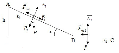 Một vật có \(m = 2kg\) trượt không vận tốc ban đầu trên mặt phẳng nghiêng nhẵn, dài \(10m\), chiều cao \(5m\). Lấy \(g = 10m/{s^2}\); hệ số ma sát trên mặt phẳng nghiêng là \({\mu _1} = 0,25\).