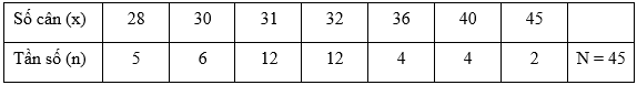 Số cân của 45 học sinh lớp 7 được chọn một cách tùy ý trong số các học sinh lớp 7 của