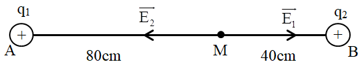 b. (1,5 điểm) Cho hai điện tích điểm \({q_1} = {6.10^{ - 8}}\,\,C\) và \({q_2} = 1,{5.10^{ - 8}}\,\,C\) đặt tại hai điểm \(A\) và \(B\) cách nhau \(120\,\,cm\) trong chân không. Xác định cường độ điện trường tổng hợp tại điểm \(M\), biết \(MA = 80\,\,cm\) và \(MB = 40\,\,cm\), hệ số tỉ lệ \(k = {9.10^9}\,\,\dfrac{{N.{m^2}}}{{{C^2}}}\).